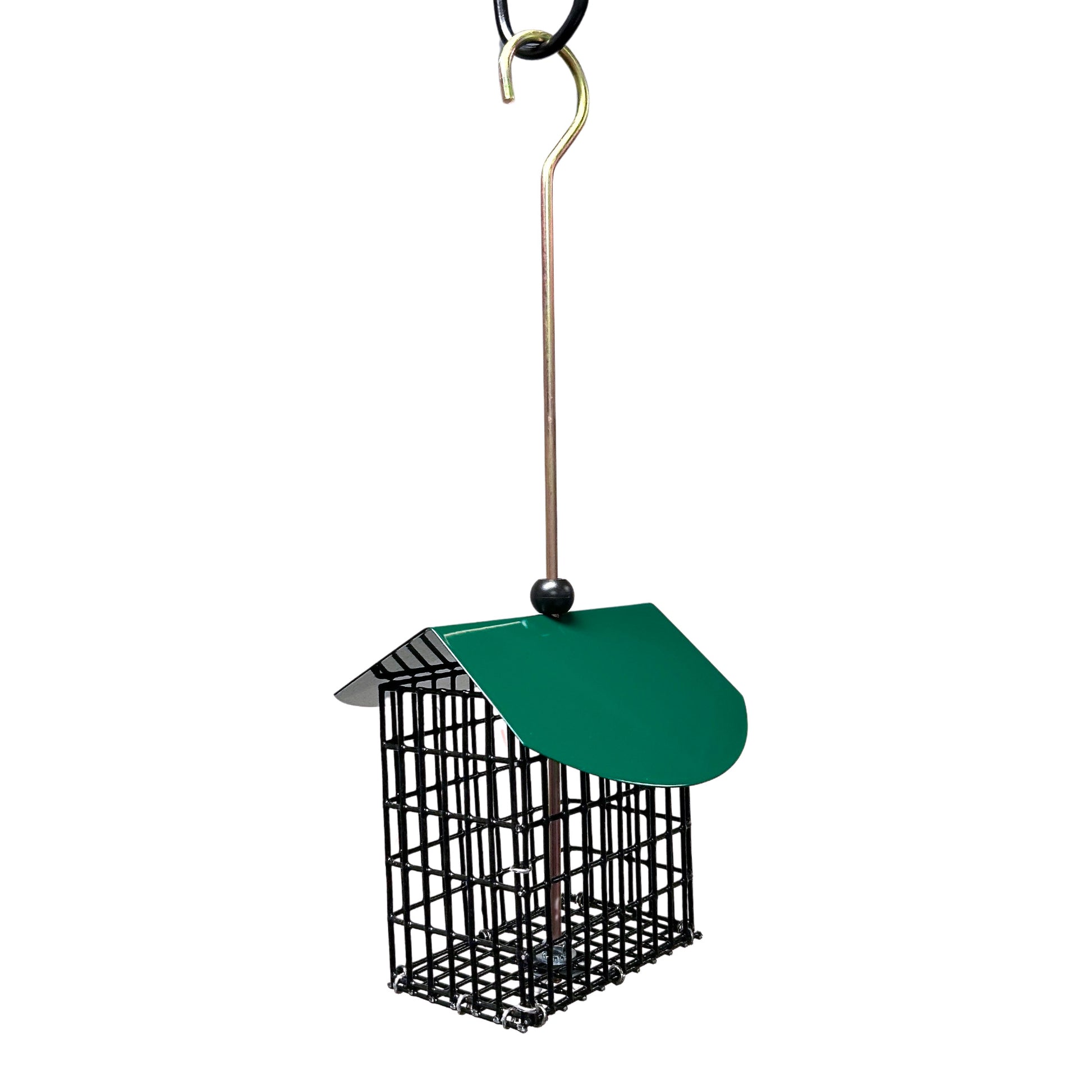 Less mess double suet cake feeder opens with one hand while in the hanging position. No need to remove feeder to fill. Galvanized steel powder-coated roof. Holds two standard suet cakes.